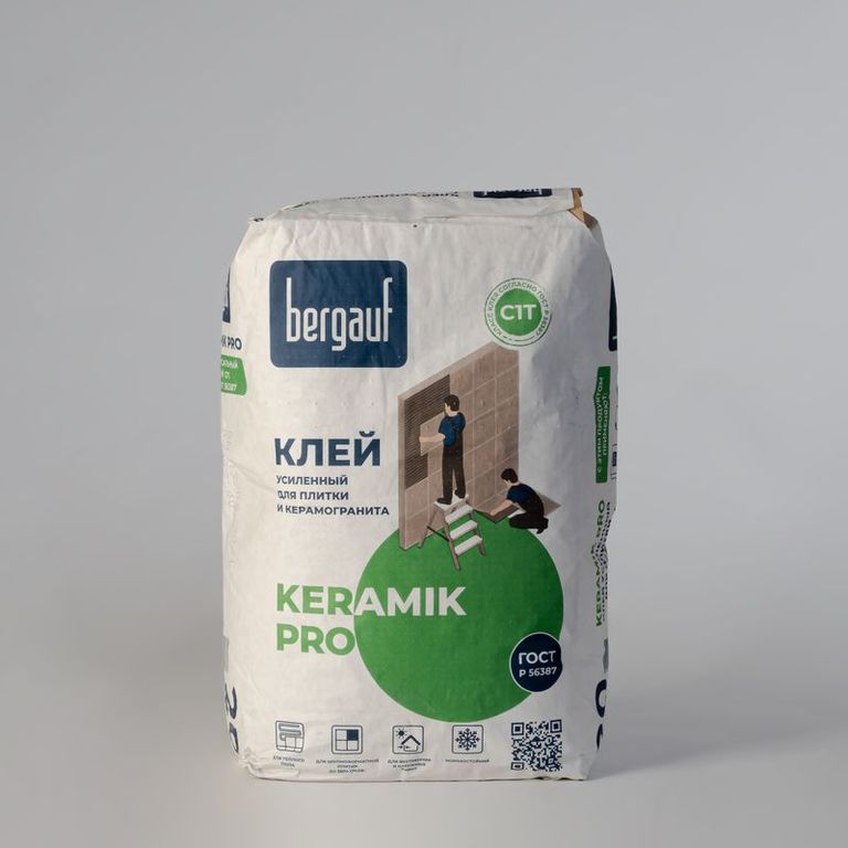 Бергауф Keramik PRO – высокоэластичный клей, предназначен для стандартной и крупной керамической плитки, камня. Рекомендован для интерьерной облицовки и для проведения работ на открытом воздухе. Предотвращает смещение плитки с горизонтального основания. Разрешен к применению для установки полов с подогревом, отделки фасадных частей, цоколей, лоджий, душевых.